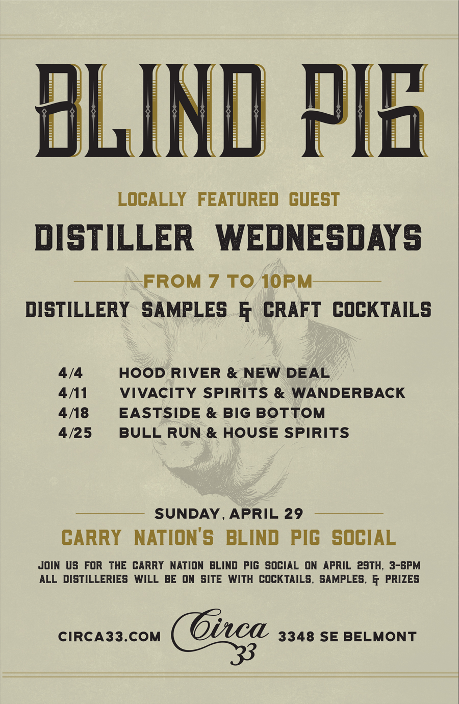 Blind Pig Distillery Tastings Wednesdays in April