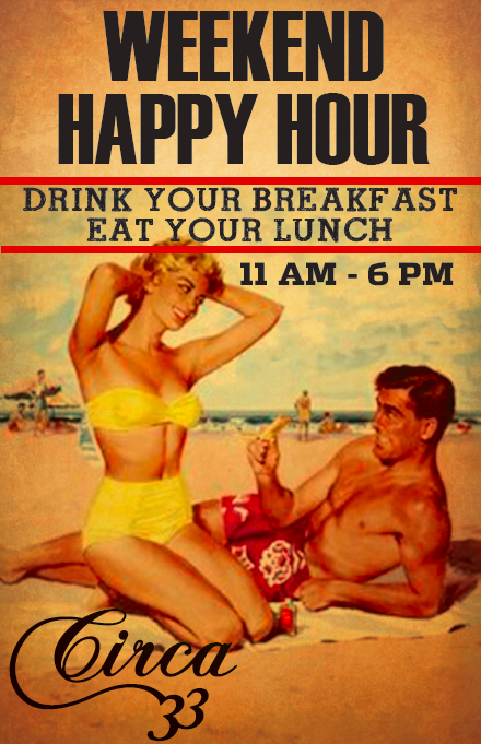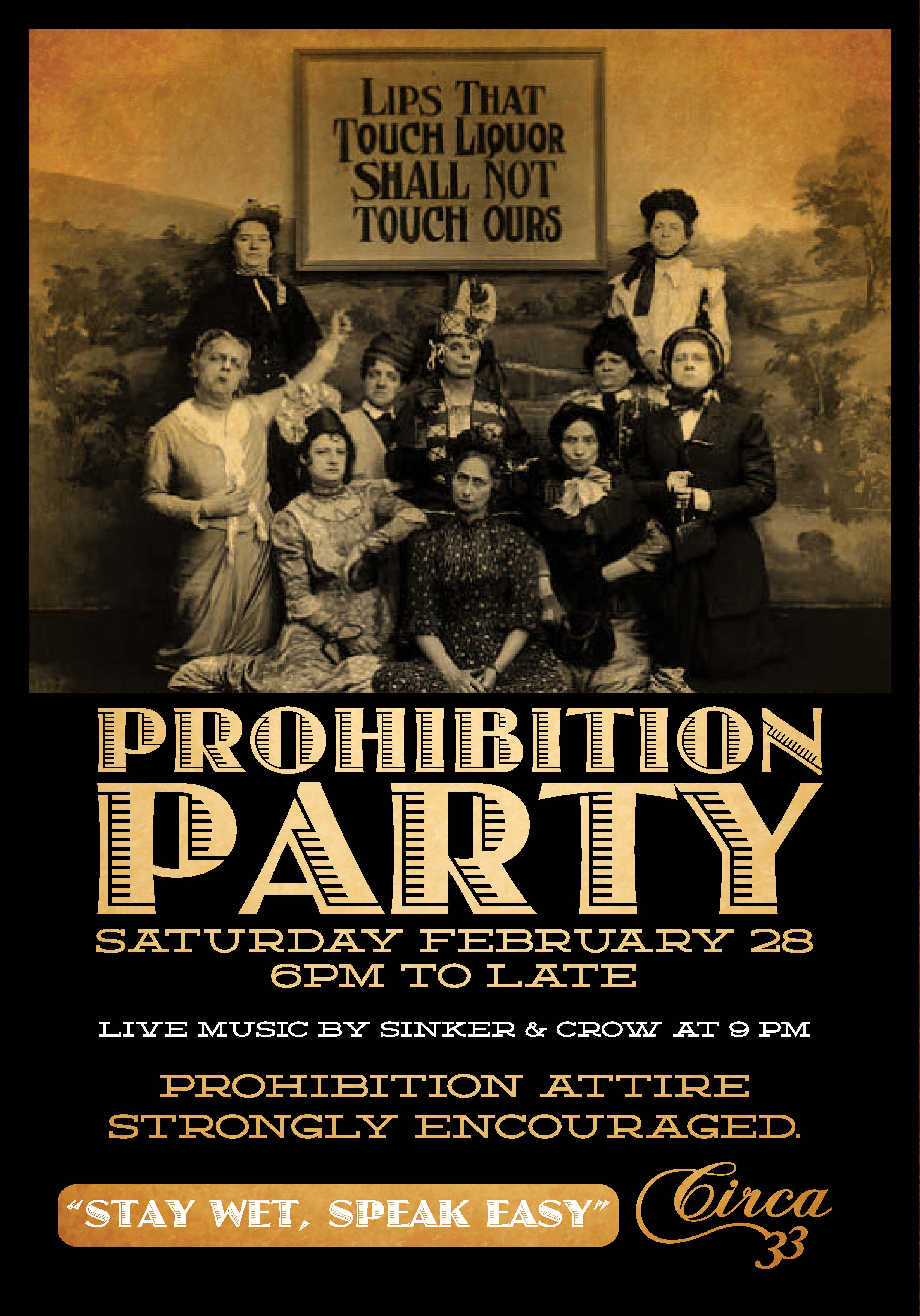 Circa 33’s signature Prohibition Party includes fantastic period cocktails, eats, and live music by Sinker & Crow. The party starts at 6pm, with live music at 9pm. Prohibition Attire is strongly encouraged. No cover.